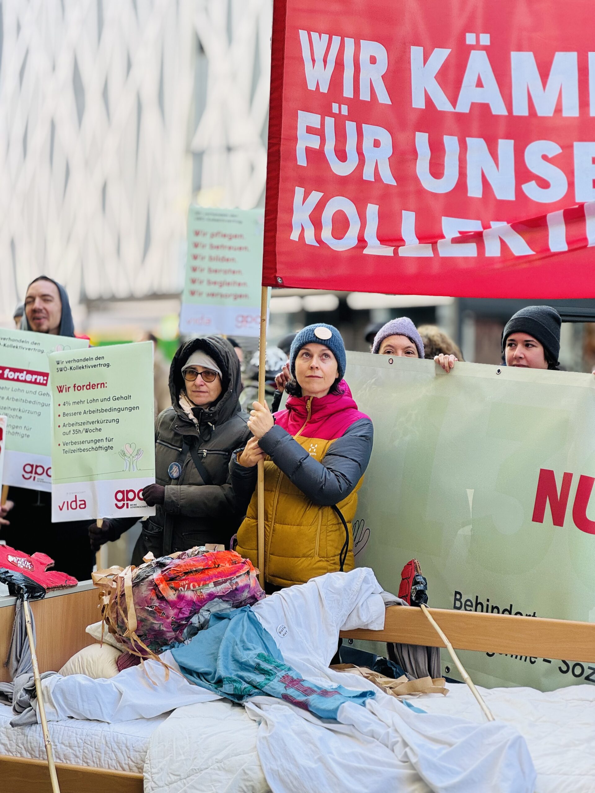 • Wien: 500 Millionen Euro werden gestrichen. Das ist ein direkter Angriff auf unsere Arbeitsbedingungen. Investitionen werden auf Eis gelegt, mobile Dienste gestoppt. Das bedeutet nicht nur, dass die Leute keine Hilfe mehr bekommen, sondern auch, dass die restlichen Mitarbeiter noch mehr schuften müssen – bis sie am Ende selbst ihren Job verlieren.